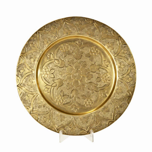 The 34cm Flat Gold Moroccan Platter can be used at home as a decorative accent piece and it can also be used on tables at events.
